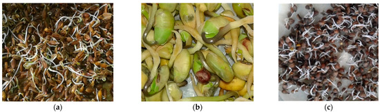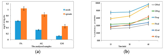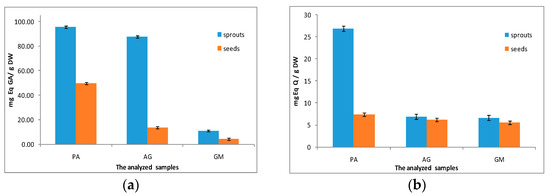 Many plant species have received attention as functional foods due to their important nutritional values [1,2,3]. For this purpose, the rich composition of certain plant seeds and sprouts in fiber, phenolic acids, flavonoids, amino acids, vitamins and trace elements has been demonstrated and the consumption of seeds and sprouts has become increasingly popular among those interested in improving and maintaining their health by adopting an improved diet [4,5]. Recently, many researchers have investigated how germination can influence the chemical composition of seeds during germination. Predominantly, the germination process would increase total phenolic and flavonoid contents or individual phenolics, however, some seed extracts showed contrasting behavior, exhibiting a decrease in phenolics, in some cases [4]. This shows that the mechanism of phytochemical development during germination varies between plant species. Phenolic compounds are considered secondary metabolites that are synthesized by plants during normal development, or in response to stress conditions, and their antioxidant properties may draw more attention to their potential as functional foods [4,6,7]. These valuable natural sources help to reduce the risk of developing various diseases and/or exerting health-promoting effects, in addition to their nutritional values.
