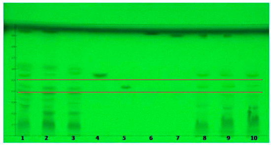 HPTLC chromatogram at 254 nm, where 1-GMsp, 2-AGsp, 3-PAsp, 4-genistin, 5-daidzin, 6-genistein, 7-daidzein, 8-GMsd, 9-AGsd, 10-PAsd.