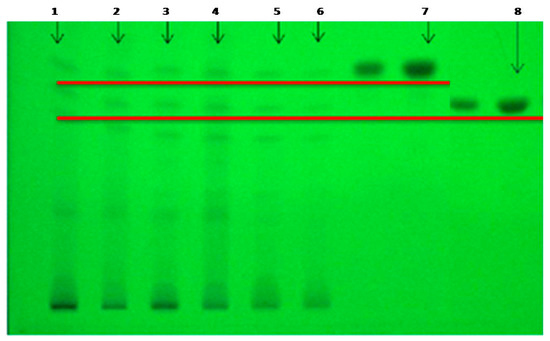 HPTLC chromatogram at 254 nm, where 1-GMsd, 2-GMsp, 3-AGsd, 4-AGsp, 5-PAsd, 6-PAsp, 7-daidzein, 8-genistein.