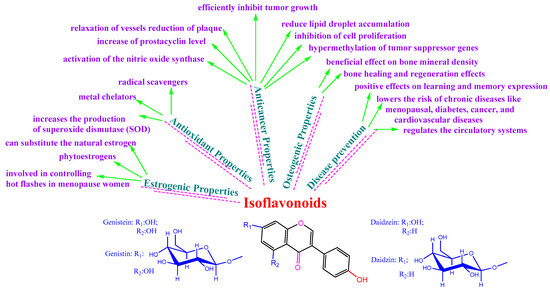 Flavonoids are among the most explored classes of natural compounds of phenylpropanoid-derived plant specialized metabolites, structurally consisting of two main groups, 2-phenylchromans and 3-phenylchromans, with approximately 10,000 different members [70]. Isoflavonoids have become a class of interest due to numerous researches into their positive effects on human and animal health, such as antioxidant, antimutagenic, estrogenic [71], antiproliferative and anticancer effects [65,72]. Usually they are known as dietary antioxidants that play an important role in human nutrition as natural chemicals that promote health [73].