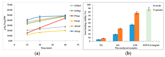 In our study, the reducing iron chelating power of seed and sprout extracts were compared to that of a known strong reducing iron chelator, Na2EDTA (Figure 7b).