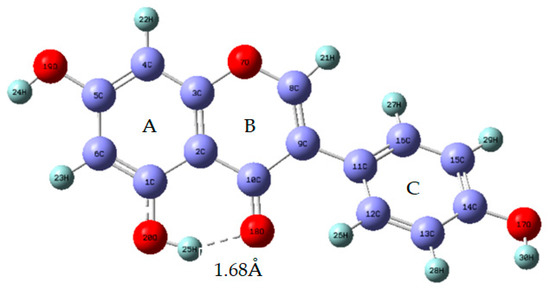 Regarding the 3D orientation of the optimized molecular structure of genistein (Figure 8), we may specify that the basic chemical skeleton, i.e., the benzopyran, is plane and the phenolic group bound to the benzopyran structure in C3 position is rotated with a torsion angle τ(C8-C9-C11-C12) of 139.31°. Also, there is an intramolecular hydrogen bond (1.68 Å length), which is formed between the hydrogen H25 from the hydroxyl group (O20-H25) at C5 position and the O18oxygen from the carbonyl group (C10=O18).