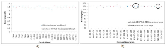 The theoretical and experimental values of geometrical parameters, i.e., bond lengths and bond angles of the genistein compound, are presented in the Table 3. For a better visualization of the differences between the theoretical and experimental values of geometrical parameters, we plotted the data as graphs, namely, Figure 9a for bonds length and Figure 9b for bonds angle.