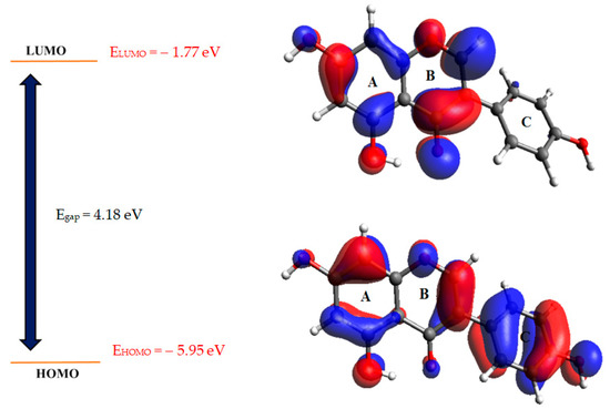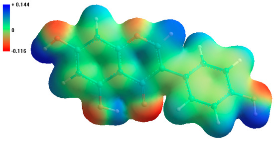 The chemical potential of genistein compound was evaluated using a series of electronic parameters, such as the dipole moment (DM), the energy of the highest occupied molecular orbital (EHOMO) and the energy of the lowest unoccupied molecular orbital (ELUMO), which were extracted from the .log output file of the Gaussian 09 program, and the gap energy (Egap), the ionization potential (IP), the electron affinity (EA), the chemical hardness (η), the chemical softness (σ), the electronegativity (χ) and electrophilic index (ω), which were calculated using specific formulas [54,55,56]. The .chk output file of the Gaussian 09 program was used as the input file for Avogadro program (Compiling Avogadro on Linux, http://avogadro.openmolecules2012, accessed on 18 March 2022) to represent the frontier molecular orbitals i.e., HOMO and LUMO, and the molecular electrostatic potential (MEP) map of the genistein compound.