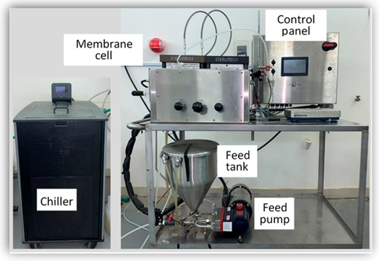 Experiments were conducted using (SEPA CF 042 Membrane Test Skid) from Sterlitech Co (Auburn, Al, USA)., which is a crossflow filtration unit that uses membranes for RO processes. The flat sheet membrane used in the device was Dow Polyamide TFC BW30XFR, with a pH range from 2–11, molecular weight cutoff (MWCO) of 100 Da with an effective membrane area of 140 cm2 (Figure 1).