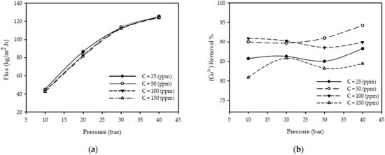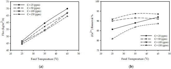 Figure 3a illustrates the influence of temperature on permeate flux for various feed concentrations and a constant feed flow and pressure. The results show that when the temperature increased from 25 to 45 °C with other constant parameters (P = 10 bar, QF = 3.2 L/min, CF = 50 ppm), the permeate flux increased 45% from 46.12 to 67.0 (kg/m2·h) (permeate flux is increasing 2% every 1 °C); this is due to the reduction in the solution viscosity and changes in the physical properties of the polymeric membrane, such as pore size or diffusivity [34]. These results are consistent with those reported in the literature [23,31,35], concluding that the permeate flux increases with the increase in temperature.