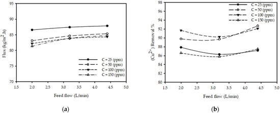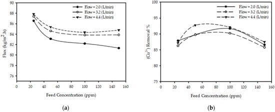 Effect of feed concentration on (a) permeate flux (b) (Cu2+) removal % at feed flow rates for constant pressure 20 (bar) and temperature 25 °C.