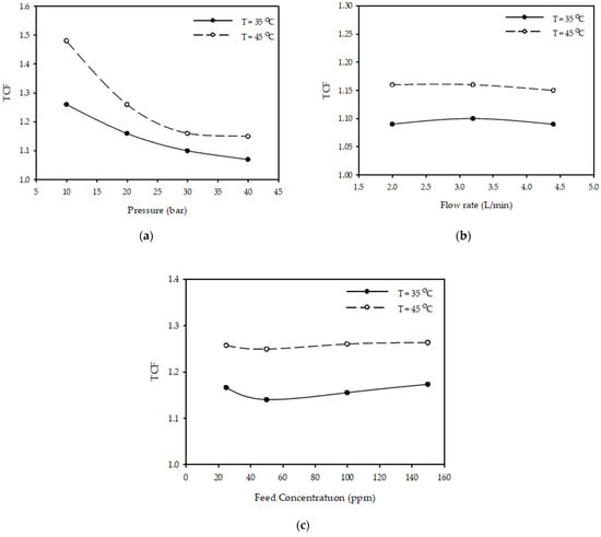 Figure 6a shows the effect of pressure on TCF at different temperatures for a constant flow rate of 3.2 (L/min) and feed concentration of 100 (ppm). The results show that as pressure increases from 10 to 40 (bar), TCF decreased 18% from 1.26 to 1.07 when the temperature was 35 °C and decreased 29% from 1.48 to 1.15 when the temperature was 45 °C.
