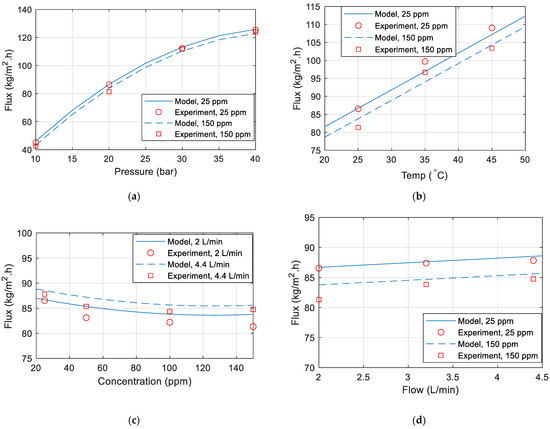 Permeate flux comparison between model and experimental data for various (a) pressure (b) temperature (c) concentration (d) flow rate.