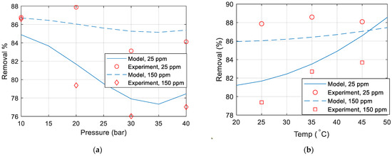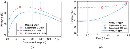 Figure 7a–d are comparisons between the model and the experiment data. Unless otherwise specified in the figure, the temperature is 25 °C, the pressure is 20 (bar), the flow is 2 L/min, and the concentration is 25 ppm. It has been noted that the model matches the data obtained from the experiments.