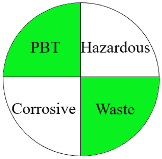 The National Environmental Method Index (NEMI) [39], introduced by the Methods and Data Comparability Board (MDCB), is the oldest and widest greenness assessment tool. NEMI is based on four quadrants that represent persistent, bio-accumulative and toxic (PBT), corrosive, hazardous and waste, as shown in Figure 1, and gives an environmental/safety profile of reagents used in chromatographic analysis. Each quadrant is colored white, which indicates less greenness of the analytical method, or green, which indicates more greenness of the analytical method. Therefore, green quadrants indicate a more eco-friendly and safe analytical method. For a hazardous quadrant, each chemical in the analytical methods is checked on the Toxics Release Inventory (TRI) chemical list [40], and if it is listed on TRI, the quadrant will be colored white, otherwise the quadrant will be green. As for PBT, searching for each chemical in its MSDS (material safety data sheet) and TRI list needs to be performed to find out which chemical is considered PBT and, hence, to color the quadrant appropriately. A corrosive quadrant depends on the pH of the chemicals used in the analytical methods, and if any mobile phase/solvent has a pH lower than 2 or more than 12, this means that the method has a corrosive impact on the environment; consequently, the corrosive quadrant will be colored white. If the amount of waste for each analytical method is more than 50 g/mL, this indicates a large waste amount, and the waste quadrant will be colored white.
