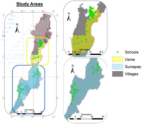 The district of Sumapaz (Figure 2) is the largest in Bogotá, with an area of 78,097 ha, and is the only purely rural district. It is located between 3000 and 4100 m above sea level and has an average temperature ranging from 4.4 to 8.3 degrees Celsius. On the other hand, Usme (Figure 2) is the third-largest locality in Bogotá with an area of 21,506 hectares, composed of 10% urban land [34]. It is characterized by its rurality, which corresponds to 86% of its total area. It is located at an altitude between 2650 and 3750 m above sea level, characterized by a mountainous relief, which is related to the average temperature being in a range between 9 °C and 12 °C in the middle zone and in the highest parts or moorlands, between 6 °C to 9 °C [34].
