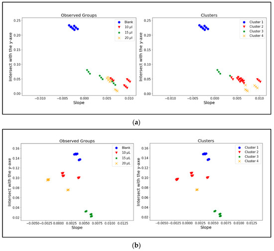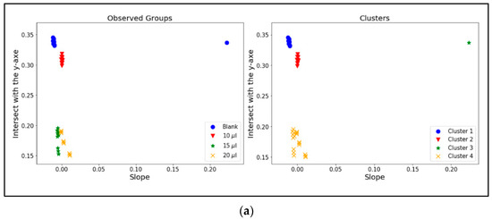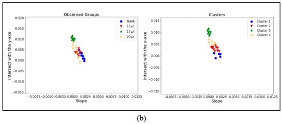 According to the ANOVA results obtained in Table 3 from trials in hair, the groups conformed under the presence of blank, 10 µL, 15 µL, and 20 µL are equivalent to the cluster obtained under the k-means methodology. The ANOVA results validate the alternative hypotheses, which consider the differences between groups. In multiple comparisons, the results between clusters 2 and 4, which are groups of 10 µL and 20 µL, respectively, could belong to the same group.