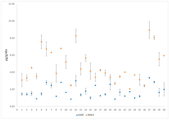 Mn concentration in human hair and nail samples.