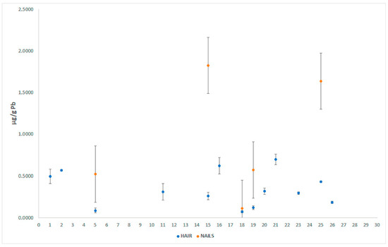 Lead (Pb) concentrations in human hair and nail samples.