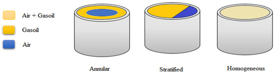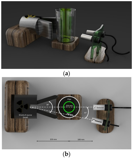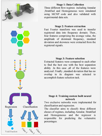 Nowadays, analyzing the flow regimes and volumetric percentages of multiphase flows is a significant and notable topic in many industries [1,2,3]. Liquids and gases are the most important elements in oil and gas storage. For better comprehension as to whether the drilling process is sensible or not, it is essential to measure each parameter [4]. Also, the separation procedure will be better developed, with adequate information about regime types and volumes of each phase. In this regard, different methods have been studied for determining the mentioned parameters. According to former studies, gamma-ray attenuation technique was the most accurate method [1]. Abro and his colleagues investigated the efficiency of single- and multi-beam gamma-ray densitometry to estimate the volumetric percentages in two-phase flows consisting of gases and liquids [5]. According to their acquired results, the multi-beam gamma ray method was more accurate than the single-beam technique. Jing and co-workers investigated dual modality densitometry to classify the flow regimes in a vertical pipe [6]. In 2014, three flow regimes (see in Figure 1) (homogeneous, annular, and stratified) were simulated via MCNP code [4]. One 137Cs source, one transmitted, and scattered detector were utilized as the proposed structure. For classifying the flow regimes and predicting volumetric percentages, three attributes of signals were extracted and used as the ANN inputs. Faghihi et al. studied stratified, homogeneous, and annular regimes in a pipe with vertical position for 3 different flow regimes [7]. Nazemi et al. investigated the gamma-ray attenuation technique in annular, bubbly, and stratified flow regimes in a two-phase flow structure. In this article, volume fraction was determined independent of regime type [8]. Two transmitted detectors were applied for registering the transmitted photons. In this situation, void fraction percentages were calculated using the MLP neural network. Nazemi et al. improved the accuracy of estimation by applying two features of registered signals in a Radial Basis Function (RBF) neural network for determining void fraction. By using the proposed method, the percentages of volume fraction were determined to be autonomous of density alterations in the liquid phase of the stratified regime [9]. Utilizing fewer detectors in structure is a matter of key importance in industries; not only does it lessen expenditures, but it also makes it easier to work with these systems. Roshani and co-workers analyzed a simple setup with single NaI detector, as well as a Co60 source, but they found that it was impossible to classify all the flow regimes using one detector in the structure, and only two of the regimes were identified [2]. Different features in the frequency domain were presented by Hanus and co-workers in order to identify the flow regimes in a dynamic condition [10]. In this work, three various structures of two-phase flows (air-water), including plug flow, bubble flow, and transitional plug-bubble flow were studied. Salgado et al. have several works which aimed to distinguish flow regimes and determine void fraction using ANNs [11,12,13,14]. Sattari et al. carried out research work by taking advantage of time-domain feature extraction for regime classification and void fraction prediction. By adopting time-domain techniques, volumetric percentages were estimated with an RMSE of 5.32 [15].