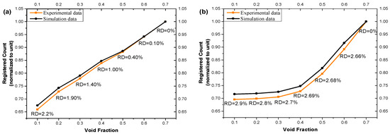 A comparison of experimental and simulation data in an annular regime for responses of (a) first transmission detector; (b) second transmission detector.