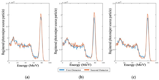 The registered photon energy spectra in the first and second detectors (void fraction = 5%): (a) annular, (b) homogenous, and (c) stratified.