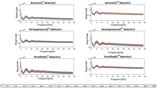A comparison of fast Fourier transforms of the three flow regimes’ signals for various air percentages in the pipe.