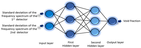 In this research, two exclusive networks were adopted for classifying the considered flow regimes and predicting volumetric percentages. Standard deviation of both detectors’ frequency spectra was utilized as the implemented ANN inputs, and the output was selected as the flow regime. Numerous ANNs with multiple numbers of neurons and hidden layers were tested and, ultimately, the optimal network was obtained. Figure 9 shows the flowchart of the proposed network to achieve an optimum network with the minimum error ratio.