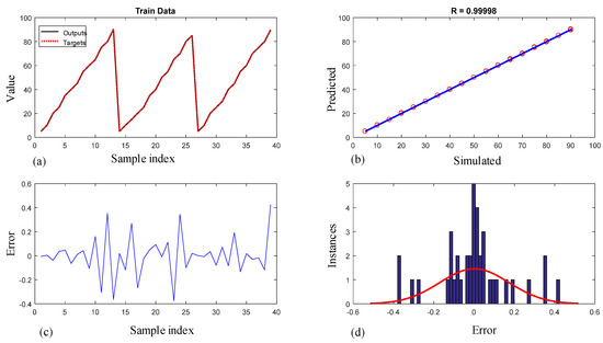 Outcomes of the training process for void fraction measurement: (a) fitting, (b) regression, (c) error, (d) error histogram diagram.