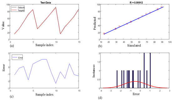 To evaluate the Adopted ANN, the root mean square error percentage (RMSE %) and coefficient of determination (R-squared) were computed by Equations (4) and (5), respectively. The errors achieved are indicated in Table 3.