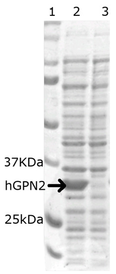 In order to verify that the vector construct was able to express the hGPN2 protein within E. coli bacteria, 1 mL was sampled before induction with IPTG (Figure 2 lane 3) and 1 mL after induction (Figure 2 lane 2), then separated using 10% SDS-PAGE electrophoresis and revealed using the Coomasie blue staining technique. The gel in Figure 2, lane 2 indicates that hGPN2 protein expression with a molecular weight of approximately 34 KDa between 25 and 37 KDa was obtained, which is the predicted value for its molecular weight.