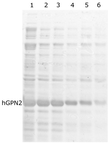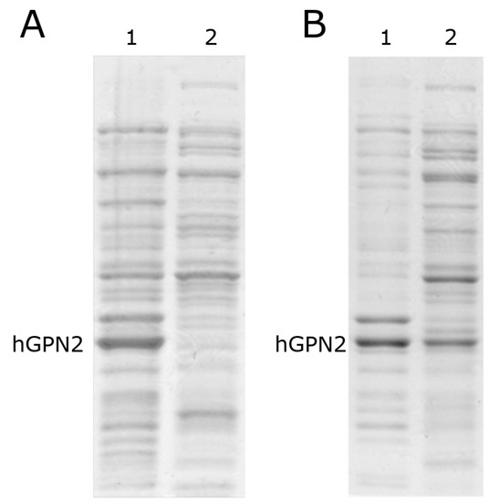 After induction with IPTG, two growth processes were carried out at different temperatures (Figure 3): the sample with the bacteria was placed in an Eppendorf tube and centrifuged for 15 min at 4 °C; the Eppendorf tube was inserted into a Branson Ultrasonics™ Sonifier™ SFX250/SFX550 Cell Disruptor-type sonicator, where it was pulsed for 30 seconds; and the tube was removed from the sonicator and cooled for 30 s on ice with salt and acetone in order to ensure that the temperature did not exceed 4 °C, preserving the inactive proteases and proteins in their native state and preventing the degradation of the latter by the activation of the former, thereby avoiding the use of protease inhibitor tablets. This process was repeated twice in order to guarantee the rupture of the whole pellet and the release of the recombinant protein from the bacteria together with the contaminating proteins. The sample was centrifuged again for 15 min at 4 °C, the supernatant was separated from the pellet, and separation was performed by 10% SDS-PAGE electrophoresis and revealed by Coomasie staining. Figure 3A shows that in the growth process at 16 °C (MG16C), the recombinant protein remained in the pellet, and was not found in the soluble fraction. When growth was performed with the temperature decreased to 10 °C (MG10C), the amount of hGPN2 protein in the pellet decreased, appearing instead in the soluble part contained in the supernatant (see Figure 3B, lane 2). Thus, analysis of the cell lysate and the culture medium showed the maximum expression of recombinant protein at 24 h of growth after induction while maintaining a temperature of 10 °C, meaning that the MG10C sample was able to obtain recombinant protein in a soluble form.