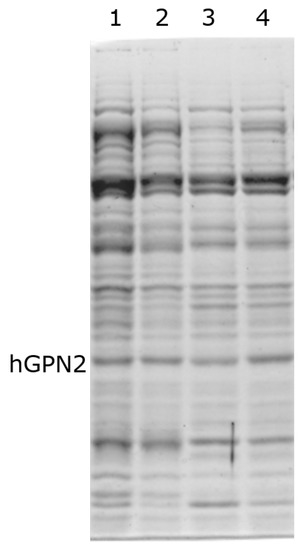 Subsequently, the same buffer was used and sodium glutamate was replaced by the amino acid lysine at concentrations of 50, 100, and 200 mM (Figure 8, lanes 1–3). By increasing the concentration of the amino acid, a reduction in the contaminants located in the lower part of the hGPN2 protein was observed, i.e., the impurities with a molecular weight lower than that of the protein of interest were reduced. However, the expressed recombinant protein suffered a reduction in the size of its band as well. When the concentration used was higher than 100 mM lysine (Figure 8, lane 2), the results obtained in terms if the elimination of impurities were not improved, as the same concentrations were maintained with both 200 mM and 100 mM of the amino acid (Figure 8, lanes 2–3).