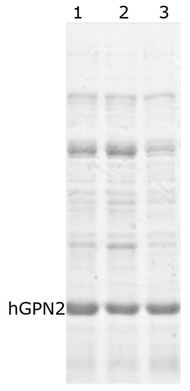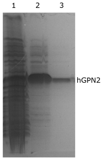 Purification of hGPN2 protein was performed using the MG10C sample with the final buffer consisting of 100 mM Tris-HCl, 5% glycerol, 0.2% Triton X-100, 100 mM NaCl, 400 µM EDTA, and 100 µM DTT at pH 8.2. The obtained results are shown in Figure 10. This set of additives completely eliminated the contaminants; the eliminated impurities are shown in Figure 10, lane 1. As there were no more bands in the lower or upper part of the hGPN2 protein, it was ultrafiltrated using a 0.5 mL Amicon® Ultra following the manufacturer’s instructions. As trace amounts of contaminants were remained (Figure 10, lane 2), the sample was returned to the IMAC column to be rotated for 20 min, the column was washed, and the protein was recovered after passing it through the desalting column, obtaining a concentration of 30 mg of completely pure hGPN2 protein as measured by Bradford analysis (Figure 10, lane 3).