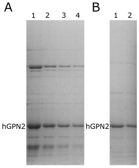When performing protein purification of recombinant protein with DTT using the MG10C sample to purify the recombinant hGPN2 protein using 100 mM Tris-HCl and 100 mM NaCl buffer, it was found that the contaminants decreased as the DTT concentration increased (Figure 6A, lanes 1–4). When using values less than or equal to 60 µM (Figure 6 lane 4), unwanted proteins were noticed at the top and bottom of the band corresponding to hGPN2, and these decreased in concentration as the amount of DTT used increased. For values of 80 µM and 100 µM (Figure 6B, lanes 1 and 2, respectively) the contaminants were significantly reduced. With 100 µM of DTT added to the buffer (Figure 6B, lane 2) a concentration of 2 mg of hGPN2 protein was obtained in pure form as measured by Bradford analysis.