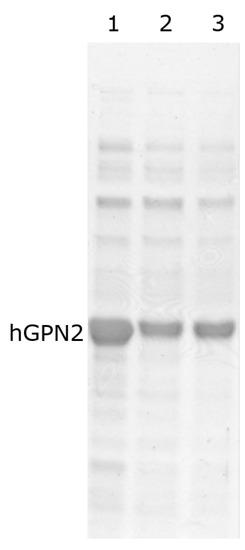 Purification of recombinant hGPN2 protein: contaminating proteins (lane 1); pure protein concentrated to 500 µl (lane 2); pure protein at a concentration of 30 mg of protein (lane 3).