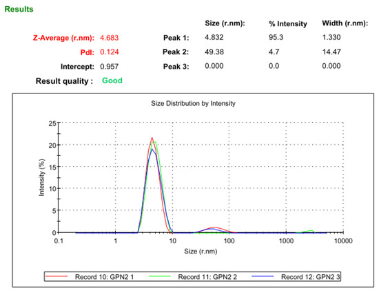 The completely pure hGPN2 protein at a concentration of 30 mg was analyzed with Malvern Nano S Dynamic Light Scattering equipment in order to determine the hydrodynamic size of the protein and polydispersity of the protein population as well as to monitor the aggregation phenomenon of the hGPN2 protein. The dynamic scattering study showed that the protein of interest has a diameter of 9.366 nm and a hydrodynamic radius of 4.683 nm, indicating that the protein is not completely globular and that certain regions are outside the hydrodynamic radius. The polydispersion achieved following the methodology proposed in this article provided a value of 0.124, indicating that the hGPN2 protein is monodisperse, homogeneous, and can be used for crystallography or structural genomics studies (see Figure 11).