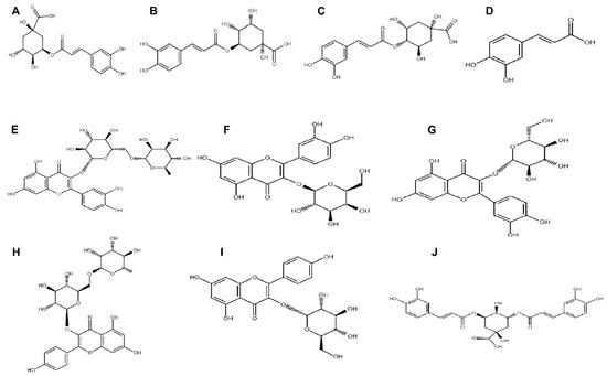 Chemical structure of the analytical standards: (A) Neochlorogenic acid, (B) Chlorogenic acid, (C) Cryptochlorogenic acid, (D) Caffeic acid, (E) Quercetin 3-rutinoside, (F) Quercetin 3-galactoside, (G) Quercetin 3-glucoside, (H) Kaempferol 3-rutinoside, (I) Kaempferol 3-glucoside, and (J) Isochlorogenic acid.
