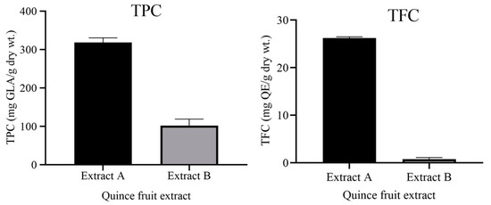 Total phenolic contents (TPC) and total flavonoid contents (TFC) of quince fruit extract. Purified extract (extract A), unpurified extract (extract B).