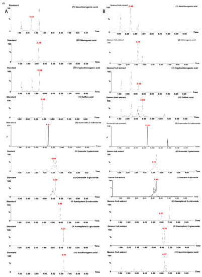 To obtain the optimal mass spectroscopy condition, all the analytical standards were detected independently in the negative and positive ionization mode. All the compounds were found in a strong response to the negative ion mode compared to the positive ion mode, making them accurately and easily detectable in the fruit extract with low content levels. In the fruit extract, the identification of each peak was carried out by confirming the molecular ion or quasi-molecular ion of the compound. The characterization of the chemical structure of the 10 detected compounds was based on the data of their mass spectroscopy including the fragment ions, quasi-molecular ions, and the retention behaviors. Typical MRM chromatograms of the standards and quince fruit extract are shown in Figure 3.