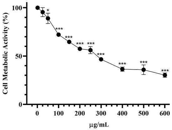 Influence of quince purified extract on 3T3-L1 cell metabolic activity determined by the PrestoBlue HS assay after 48 h exposure to the extract; control cells were not exposed to any compound; values are means ± standard deviations from at least three independent experiments, n ≥ 12; statistical significance was calculated versus control cells (untreated), * p ≤ 0.05, *** p ≤ 0.001.