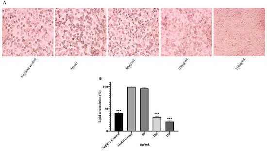 Cell lipid droplets stained with Oil red O were visualized under a microscope (A). Percentage (%) of accumulated lipid droplets in 3T3-L1 cells stained with Oil red O was observed on the 8th day of differentiation compared with the model group (B). The control cells were not exposed to any compound. The model cells were not treated with the extract; the values are means ± standard deviations from at least three independent experiments, n ≥ 12; the statistical significance was calculated versus the control cells *** p ≤ 0.001 vs. model group.