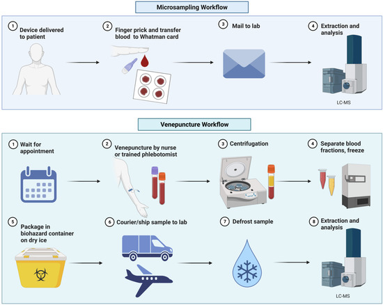 When considering applications of metabolic phenotyping, the gold standard for measurement is venous whole blood, which is commonly taken from the anti-cubital fossa, and then separated into either plasma or serum [5]. This entails time-consuming protocols for a venepuncture blood collection to occur in an approved clinical space, scheduling an appointment in advance with a trained phlebotomist, and, depending on the nature of research, it may require a patient to abstain from food for >8 h and travel to a laboratory for blood collection. Furthermore, the lengthy post-collection protocols that venepuncture necessitates include sample processing via centrifugation, splitting (into smaller aliquots), and freezing at −80 °C prior to cold-chain transport, which further add to the burden of sample collection and economic costs, which impact budgets [6,7]. In the laboratory, if the sample is intended for metabolic phenotyping technologies, whole blood from the collection then needs to be separated into either serum or plasma and frozen to ensure the long-term integrity of the sample. Venepuncture presents two main issues: reduced study sizes and the inability to perform frequent sampling [8]. As such, venepuncture may limit the scope for metabolic phenotyping research, particularly in research areas that include remote or rural populations, patients with limited mobility, or those who are immunocompromised. This diminishes opportunities for research teams and population-based studies [9,10,11].