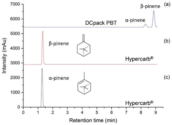Comparison of α-pinene and β-pinene separation using CO2 (A) and methanol (B) mobile phase, flow rate of 1.5 mL/min, gradient mode: 0.0–3.0 min (0% B), 3.0–16.0 min (0–10% B), 16.0–17.0 min (10–0% B) and 17.0–19.0 min (0% B): (a) Two columns in series a Hypercarb® (150 mm × 4.6 mm, 5 µm) and a Poly-(butylene terephthalate) DCpack PBT(150 mm × 4.6 mm, 5 µm), DAICEL Corporation (Osaka, Japan). (b,c) standards of α-pinene and β-pinene only using a Hypercarb® (150 mm × 4.6 mm, 5 µm).