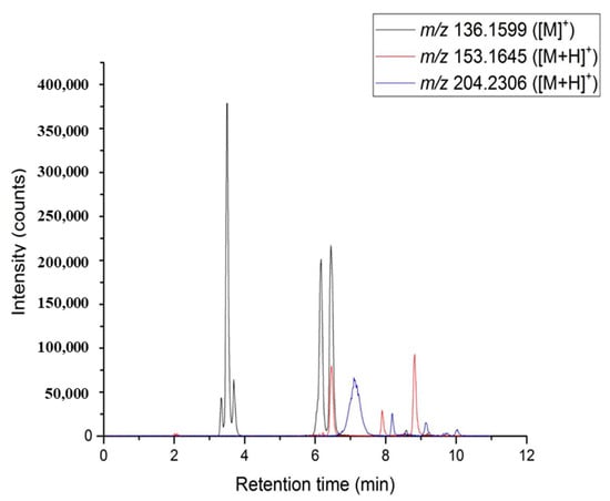 Overlay of EIC chromatograms: (black line) m/z 136.1599 for monoterpenes, (red line) m/z 153.1645 for oxygenated monoterpenes, (blue line) m/z 204.2306 for sesquiterpenes.