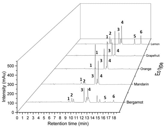 Comparison of chromatographic profiles of bergamot, mandarin, orange, grapefruit and lemon essential oils obtained by SFC-UV. Chromatographic conditions: CO2 (A) and methanol (B) mobile phase, flow rate of 1.5 mL/min, gradient mode: 0.0–3.0 min (0% B), 3.0–16.0 min (0–10% B), 16.0–17.0 min (10–0% B) and 17.0–19.0 min (0% B): (grey line). Two columns in series: Hypercarb® (150 mm × 4.6 mm, 5 µm) and Poly-(butylene terephthalate) DCpack PBT(150 mm × 4.6 mm, 5 µm). Identified peaks (1) α-pinene, (2) β-pinene, (3) γ-terpinene, (4) limonene, (5, 6) citral.