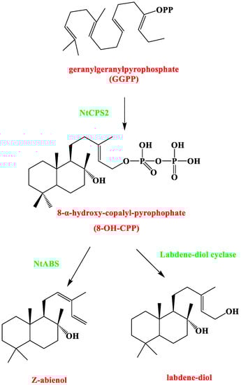 - Sallaud, C.; Giacalone, C.; Tpfer, R.; Goepfert, S.; Tissier, A. Characterization of two genes for the biosynthesis of the labdane diterpene Z-abienol in tobacco (Nicotiana tabacum) glandular trichomes. Plant J. 2012, 72, 1–17. [Google Scholar] [CrossRef]
