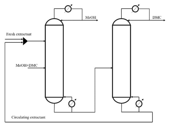 A dividing wall column (DWC) is a special structure of thermocouple distillation [12,13,14]. Partitions are installed in the column to prevent the back-mixing effect and greatly reduce energy consumption [14]. In recent years, researchers have focused on the application of dividing wall column technology in special distillation systems, such as reactive distillation [15], extractive distillation [16], azeotropic distillation [17] and other new fields, in order to minimize energy consumption. In this paper, the methanol and DMC azeotrope system will be separated by the organic fusion of an extractive distillation column and the introduction technology of the DWC, namely, the extractive dividing wall column (EDWC) [18,19,20,21,22,23]. Peng et al. [20] studied the separation of pentane mixture by EDWC, the results showed that the back-mixing could be avoided effectively and the distillation efficiency could be improved by EDWC. Compared with the conventional process, EDWC could save energy by 18.1% and reduce the investment in related column equipment. Shen [22] found that the separation of vinyl acetate–methanol by EDWC could save total energy consumption by 46.8% and total cost by RMB 11.797 million per year. In this paper, the simulation and optimization of the conventional extractive process (CEP) and extractive dividing wall column (EDWC) were carried out by Aspen Plus software. Simultaneously, in order to meet the requirements of separation, lower energy consumption and investment cost were obtained by using a univariate analysis of the optimal operating parameters of the EDWC.