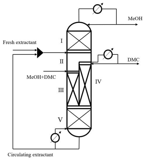 On the basis of CEP, the performance of EDWC was investigated, whose structure [12] is shown in Figure 2. A partition is set in the middle of the column, and the whole column is divided into 5 different zones according to the feeding position of extractant and raw material. Zone (I) is the extraction agent recovery section, which mainly realizes the removal of the extraction agent aniline and obtains high purity methanol products at the top of the column, which is equivalent to the distillation section above the feeding position of the extraction agent of the EDC in the CEP. Zone (II) is the distillation section, which mainly realizes the extraction of DMC from the raw material liquid by the extraction agent aniline, which is equivalent to the distillation section of the EDC in the CEP between the extraction agent feeding position and the raw material liquid feeding position. Zone (III) is the extractive distillation section, which mainly removes a small amount of methanol and is equivalent to the extractive distillation section of the EDC in the CEP. Zone (IV) is the side-line distillation section, which mainly achieves the separation of DMC and the extraction agent aniline, and obtains DMC products with a mass fraction higher than 99.8% at the top, which is equivalent to the distillation section of the ERC in the CEP. Zone (V) is the extraction and distillation section of the extractant, which mainly realizes the concentration of the extraction agent aniline. This zone is equivalent to the extraction and distillation section of the ERC in the CEP. Zones (I), (II), (III) and (V) are called the main column, and zone (IV) is the attached column.