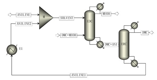 A large number of chemical raw materials for chemical production are toxic, which will do great harm to human beings and the environment. For the sustainable development of the human living environment, at the end of the 1960s, human beings began to pay attention to environmental problems. Various countries have also promulgated environmental protection laws and regulations and formulated emission standards for various pollutants. However, this terminal control of pollution can only play a role in controlling pollution for a certain range of time. The fundamental solution to pollution control is to use “green technology” chemical production, as far as possible to choose non-toxic or low toxicity chemical raw materials and as far as possible to use non-pollutant chemical processes [1]. Therefore, it is urgent to find non-toxic and harmless basic chemical raw materials. Dimethyl carbonate (DMC), as a non-toxic and non-corrosive liquid, is one of the green chemical products with development prospects in recent years. It can be used as an important component of polycarbonate and other organic syntheses, methylating agent, solvent and fuel additive for lithium-ion batteries, etc. In the synthesis process of DMC, the most promising synthesis route is to use vinyl carbonate as the intermediate and then vinyl carbonate and methanol to further synthesize DMC and glycerol. The efficient separation of methanol and DMC azeotrope system is involved in the synthesis process [2,3]. In industry, special distillation methods such as extractive distillation [2,4,5], azeotropic distillation [6], membrane separation [7,8] and variable pressure distillation [9,10] are often used to separate methanol and DMC. The selection of extractant is the key to extractive distillation separation. Extractants such as vinyl carbonate, aniline and ethylene glycol have been reported [3,11], among which aniline as an extraction agent can save 25.46% of equipment investment and 42.30% of the total cost [11]. Therefore, aniline was selected as the extraction agent despite its toxicity. However, rectification column energy consumption is huge, thermodynamic efficiency is low, so more and more experts are committed to the development of high energy efficiency of the process, in order to reduce energy consumption and CO2 emissions, to help achieve the “dual carbon” goal.