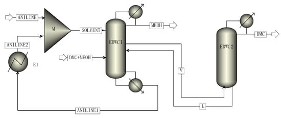 The simulation process of methanol and DMC by EDWC is shown in Figure 4, including the main column (EDWC1) and the attached column (EDWC2). Finally, high purity methanol products were obtained at the top of the main column EDWC1, and high purity DMC products were obtained at the top of the attached column EDWC2. At the bottom of the attached column, the mixture of aniline and DMC was returned to the main column (EDWC1) for further separation.