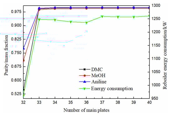 As can be seen from Figure 5, the purity of methanol, DMC and solvent aniline all increased first and then slowly increased with the increase of the number of the main column, and finally tended to be stable. When the theoretical plate number was 36, the purity of DMC reached above 0.998, and the energy consumption column was relatively low. Therefore, the optimal theoretical plate number for the main column was determined to be 36.