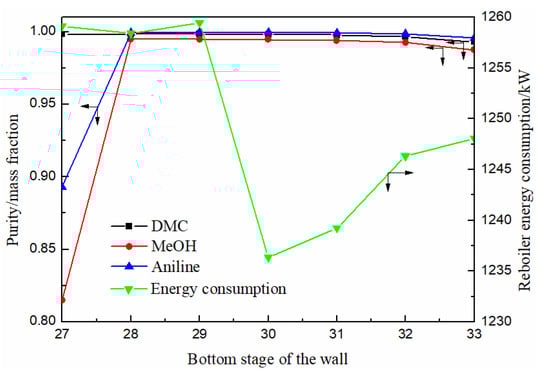 As can be seen from Figure 6, the purity of DMC decreased slowly with the downward movement of the bottom position of the partition, while methanol and solvent aniline both increased first and then decreased slowly. When the bottom position of the partition was between 27–30 stages, the purity of DMC reached above 0.998, which can meet the separation requirements. The energy consumption decreased first and then increased with the position of the bottom of the partition moving down. When the bottom of the position was located at the 30th stage, the energy consumption of the reboiler reached the lowest. Therefore, the optimal position of the partition was determined as the 30th stage.