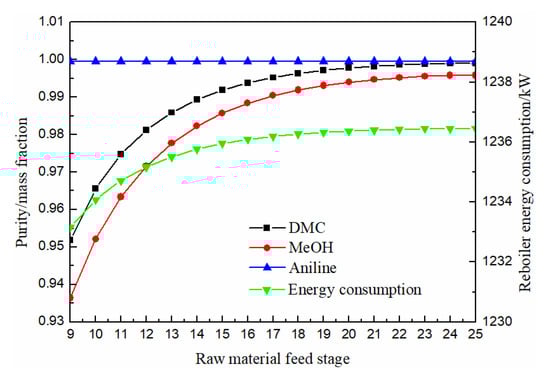 As can be seen from Figure 7, both methanol and DMC increased first and then slowly stabilized with the downward movement of the feeding position of raw materials. When the feeding position of raw materials was greater than 21 stage, DMC purity reached above 0.998, and solvent aniline was almost not affected by the feeding position of raw materials. The energy consumption column increased first and then slowly stabilized with the downward movement of the feeding position. Therefore, the optimal feeding position of raw material was finally determined as the 21st stage.